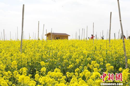 陜西延安市寶塔區(qū)川口鄉(xiāng)打造的“蘋果樹油菜花”觀賞基地4月23日人頭攢動,游客們被黃土高原上的這片油菜花海所吸引。