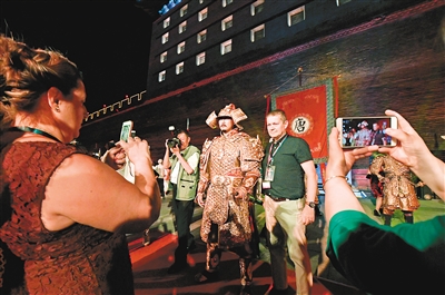 仿唐入城儀式結束后,游客和“武士”合影。記者 張宇明 攝