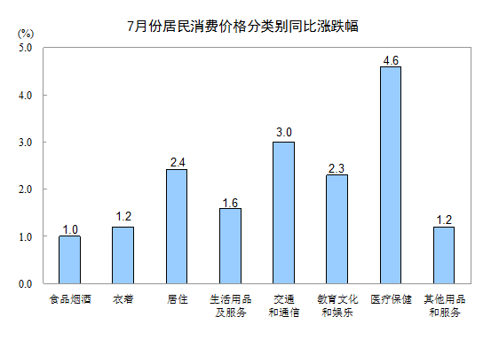 其他七大類價(jià)格同比均上漲。其中,醫(yī)療保健、交通和通信、居住價(jià)格上漲率排前三,分別上漲4.6%、3.0%和2.4%。