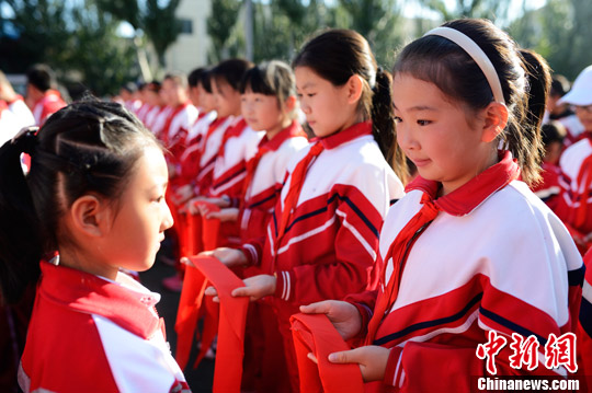 資料圖:某小學(xué)高年級(jí)同學(xué)為一年級(jí)新生佩戴紅領(lǐng)巾。(圖文無(wú)關(guān)) 中新社記者 劉文華 攝