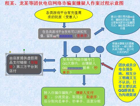 經(jīng)過大量排查工作,2017年1月15日,民警在常德市一網(wǎng)吧內(nèi)將嫌疑人程某及其女友龍某抓獲。通過對嫌疑人的審訊和排查嫌疑人作案使用的手機(jī)記錄分析,辦案民警查清程某及龍某都為一網(wǎng)絡(luò)詐騙龐大QQ群的其中一員,該團(tuán)伙成員分布全國各地,相互分工明確又互不認(rèn)識,日常主要以QQ群消息為溝通渠道。在該團(tuán)伙中負(fù)責(zé)在各類手游、網(wǎng)游上發(fā)布各種代充信息,騙取受害人支付寶截圖的被稱為“丟單手”,負(fù)責(zé)給受害人發(fā)送收款碼、鏈接,套取受害人支付寶錢款的被稱為“秒單手”,具體詐騙手段為“丟單手”在游戲內(nèi)刷屏發(fā)布低價(jià)出售Q幣、點(diǎn)卡、代刷副本等信息,引誘游戲玩家聯(lián)系購買,收到小額訂金后,“丟單手”通過正規(guī)渠道為受害人正常充值取得信任。隨后“丟單手”將受害人信息發(fā)布到詐騙的QQ群內(nèi),由 “秒單手”接單冒充“充值客服”進(jìn)行詐騙。他們通過修改二維碼和制作虛假鏈接,在后臺修改轉(zhuǎn)賬金額,將受害人的錢騙走。隨后通過被稱為“店家”的第三方支付平臺將資金轉(zhuǎn)出,“丟單手”、“秒單手”和“店家”按比例分成,已抓獲的嫌疑人中,程某的身份即為“秒單手”,龍某的身份則為“店家”,而關(guān)鍵的嫌疑人“丟單手”仍藏在冰山之下。