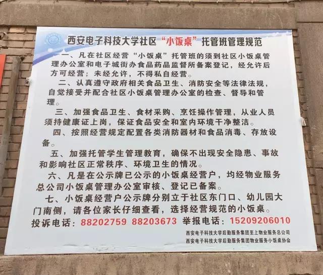 西安電子科技大學(xué)社區(qū)內(nèi)托管班招牌上附有“小飯桌登記備案戶”牌匾圖片 圖片來自大秦之聲