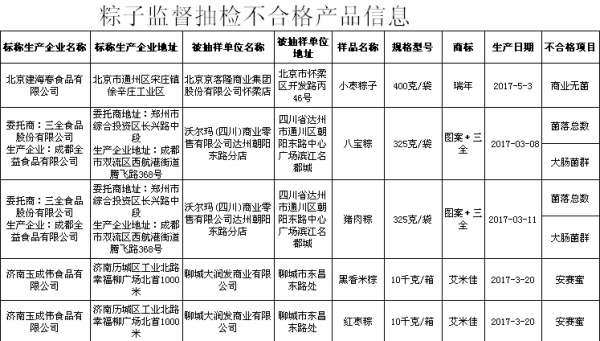 北京市食藥監(jiān)局通報(bào)的4批次不合格的粽子是:北京市聚高府食品有限公司生產(chǎn)的生產(chǎn)日期/批號(hào)為2017-5-2,規(guī)格型號(hào)為280g (140g×2粒)/袋的“蜜棗粽子”;北京長(zhǎng)升居食品有限公司生產(chǎn)的生產(chǎn)日期為2017-5-9,規(guī)格型號(hào)為計(jì)量稱重的“紅棗粽子”;標(biāo)稱為北京市聚高府食品有限公司生產(chǎn),生產(chǎn)日期為2017-3-20,規(guī)格型號(hào)為280g/袋的“蜜棗粽子”;標(biāo)稱北京建海春食品有限公司生產(chǎn),生產(chǎn)日期為2017-5-7,規(guī)格型號(hào)為400克(100克×4)/袋的“小棗粽子”。