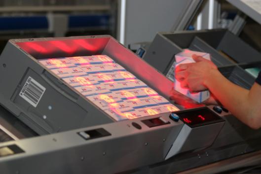 如果系統(tǒng)中提示有訂單需要揀選,旋轉(zhuǎn)貨架能迅速并且準(zhǔn)確地找到含有訂單內(nèi)商品的周轉(zhuǎn)箱,并自動(dòng)把周轉(zhuǎn)箱送上傳送帶。當(dāng)周轉(zhuǎn)箱到達(dá)工作站時(shí),工作站的屏幕上會(huì)顯示每筆訂單需要揀選出的貨品和數(shù)量,作業(yè)人員根據(jù)指示拿貨即可。因此,揀選人員無(wú)需步行,在這一模式下,其揀選速度可以達(dá)到1200件/小時(shí)。據(jù)計(jì)算,這種速度是傳統(tǒng)人找貨揀選方式的10倍以上。