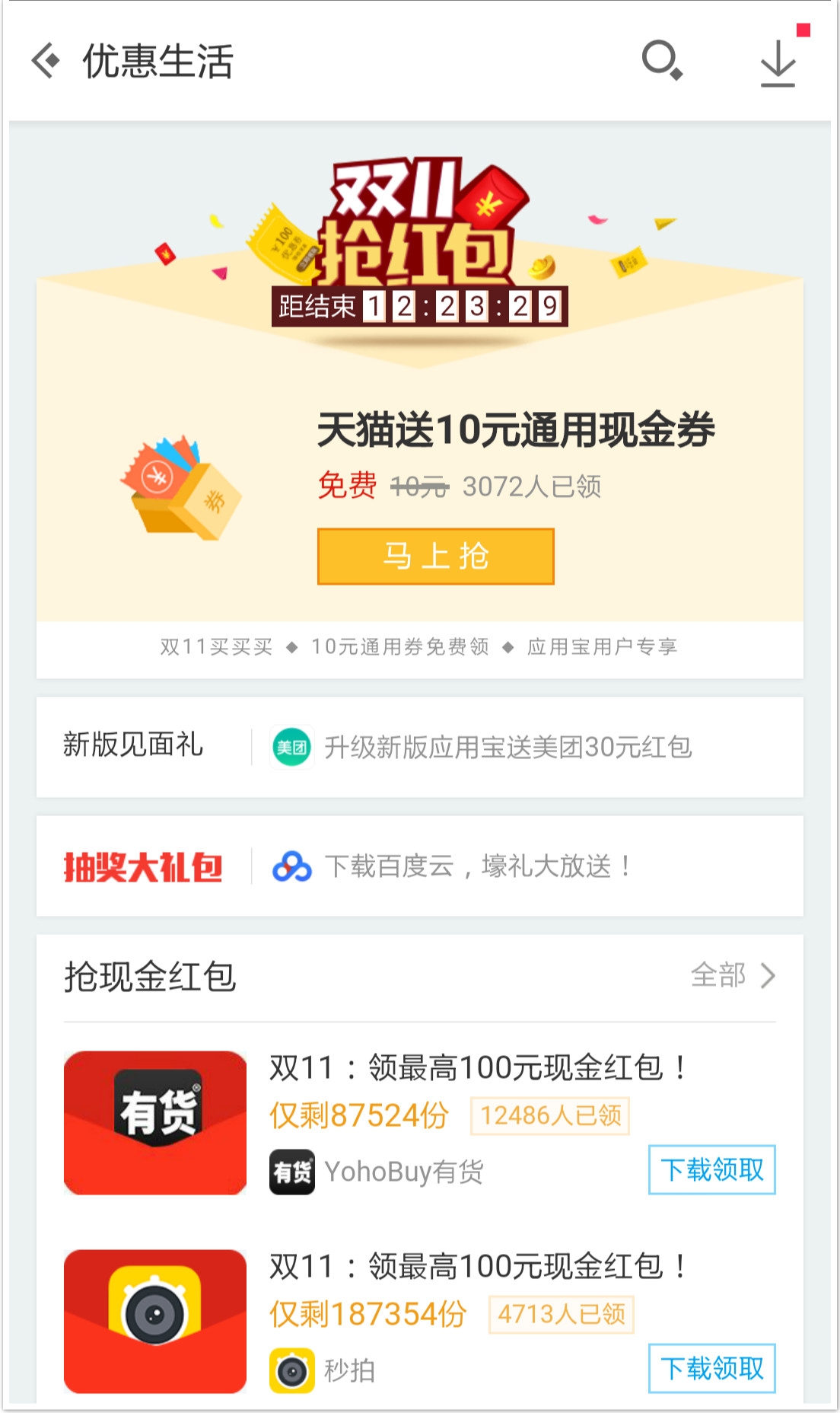 應(yīng)用寶“優(yōu)惠生活”版塊