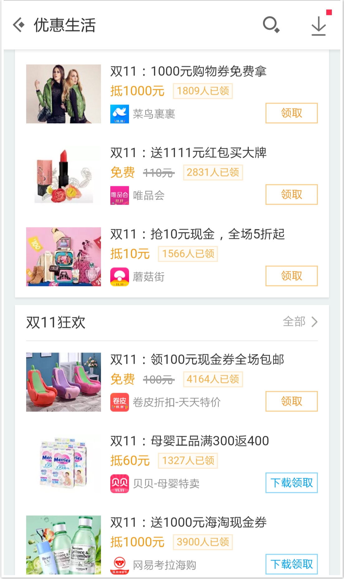 在“優(yōu)惠生活”版塊中,用戶可直接領(lǐng)取天貓10元通用現(xiàn)金券,用于“雙11”當(dāng)天天貓參與“雙11”活動(dòng)的全部商家,現(xiàn)金券可跨店、可疊加。用戶還可100%領(lǐng)取“雙11”阿里巴巴菜鳥裹裹1000元購物優(yōu)惠券,其中包含:天貓超市優(yōu)惠券、天貓儷人購物優(yōu)惠券、天貓服飾、化妝品、電器、運(yùn)動(dòng)裝備及話費(fèi)、流量、火車票優(yōu)惠券,助力用戶最后全球狂歡購。