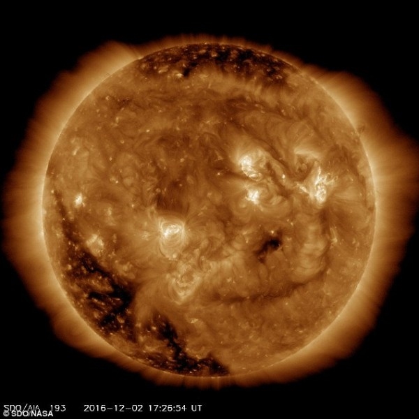 科學(xué)家Karl Battams表示,眼睛可能是太陽的活躍區(qū)域,而嘴上的細(xì)絲是太陽大氣中的等離子體,同時,在兩側(cè)類似頭發(fā)的黑斑是日冕洞。