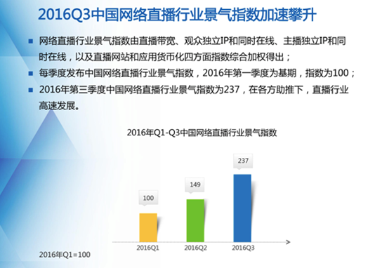 網(wǎng)絡(luò)直播行業(yè)景氣指數(shù)由直播帶寬、觀眾獨(dú)立IP和獨(dú)立在線、主播獨(dú)立IP和同時(shí)在線,以及直播網(wǎng)站和應(yīng)用貨幣化四方面指數(shù)綜合加權(quán)得出。景氣指數(shù)每季度發(fā)布,2016年第一季度為基期,指數(shù)為100。