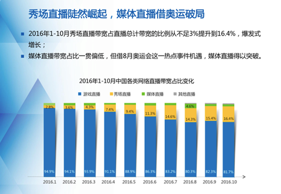 從不同類型直播的帶寬占比來看,2016年1-10月秀場直播帶寬占直播總計(jì)帶寬的比例從不足3%提升至16.4%,實(shí)現(xiàn)爆發(fā)式增長,相比1月,10月秀場直播帶寬指數(shù)已增長超9倍;媒體直播帶寬占比一貫偏低,但借8月奧運(yùn)會(huì)這一熱點(diǎn)事件機(jī)遇,媒體直播得以突破;游戲直播帶寬總量穩(wěn)定增長,借暑假和十一假期保持加速增長勢頭。
