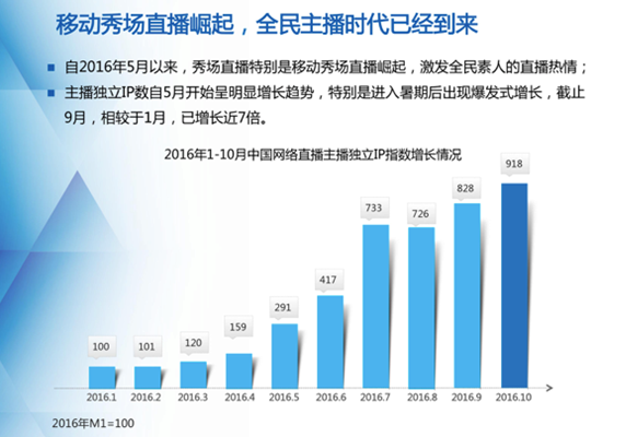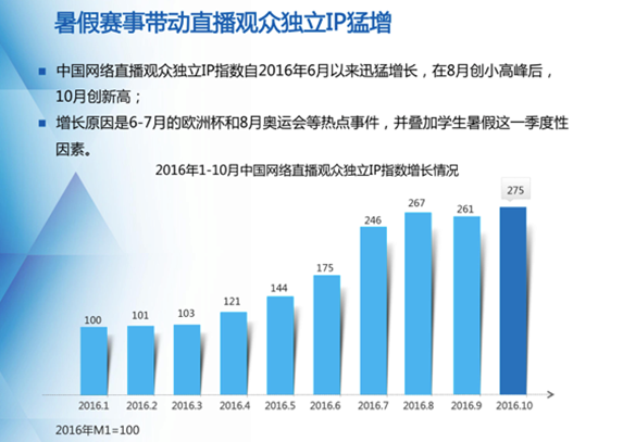 從中國網(wǎng)絡(luò)直播觀眾方面來看,觀眾獨(dú)立IP指數(shù)自2016年6月以來迅猛增長,在8月創(chuàng)小高峰后,10月創(chuàng)新高,增長原因在于6-7月的歐洲杯以及8月奧運(yùn)會(huì)等熱點(diǎn)事件,并疊加了學(xué)生暑假這一季度性因素。
