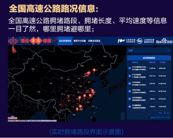 圍繞春運(yùn)出行高峰,百度地圖除了上線春運(yùn)系列直播間,還在公安部交管局指導(dǎo)下,與公安部交通管理科學(xué)研究所合作開展了2017年春運(yùn)“平安播報(bào)”活動,可為全國用戶提供高速公路路況信息、重要節(jié)點(diǎn)流量信息、團(tuán)霧多發(fā)路段信息,以及通過百度地圖APP還可以收到沿途惡劣天氣導(dǎo)致的交通管制信息等語音提示,借助大數(shù)據(jù)讓用戶平安返鄉(xiāng)。