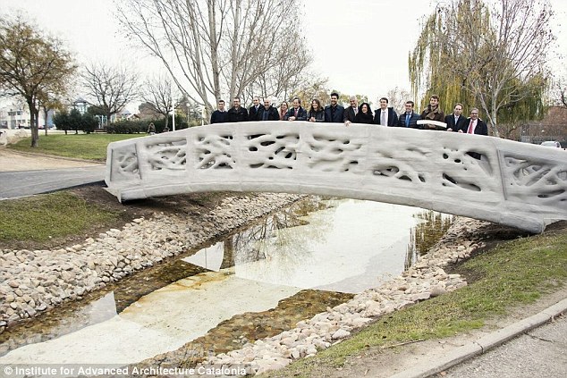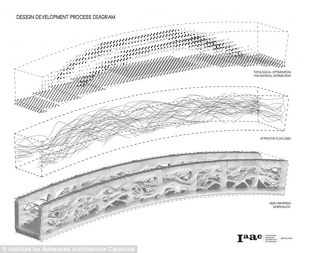 加泰羅尼亞高等建筑研究院負(fù)責(zé)整座橋的設(shè)計,設(shè)計團隊負(fù)責(zé)人 Areti Markopoulou表示:“傳統(tǒng)建筑建造過程不可避免地存在大量材料浪費,但3D打印技術(shù)可以控制材料的使用! “通常情況下,我們受制于簡單的建筑幾何圖形,因為制造復(fù)雜的模具十分復(fù)雜費錢! “但在建造這座橋時,我們能用復(fù)雜但似乎自然天成的模具進(jìn)行實驗,并且能夠設(shè)計出用傳統(tǒng)方式無法完成的建筑圖形。”