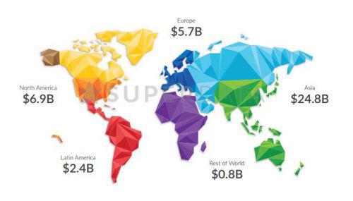 報(bào)告指出,2016年VR市場(chǎng)PC端總產(chǎn)值為7.18億美元,移動(dòng)端6.87億美元,主機(jī)端為4.11億美元。在營收中,游戲表現(xiàn)搶眼,占據(jù)了44%的市場(chǎng)份額。除此之外,數(shù)據(jù)顯示,全球移動(dòng)游戲收入為406億美元,手游市場(chǎng)規(guī)模已與全球電影票房收入持平,而且仍在高速增長(zhǎng)。亞洲市場(chǎng)在整個(gè)手游市場(chǎng)中占據(jù)領(lǐng)導(dǎo)地位,份額達(dá)248億美元,北美以69億美元位居其次,歐洲以57美元位居第三。(TechWeb)