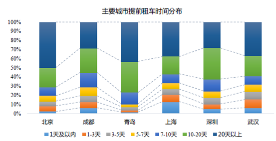 節(jié)假日租車的一大特性是提前訂車的用戶多,正所謂“身未動心先行”。滴滴出行租車大數(shù)據(jù)顯示,北方城市人們更傾向于提前規(guī)劃行程,以北京、青島為例,提前10天以上預訂租車的人數(shù)占比超過70%,而南方城市如成都、深圳、武漢等,該比例在55%左右。