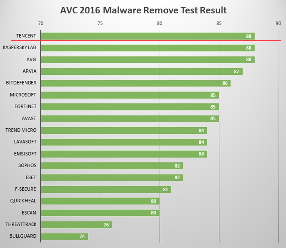 同時,值得一提的是,清除測試系騰訊電腦管家(英文版)2016年首次參測的項目,在和卡巴斯基、AVG等國際知名殺軟的同場競技中,騰訊電腦管家(英文版)憑借自研殺毒引擎TAV,以出色的清除能力取得最高分,與卡巴斯基、AVG并列排名世界第一,榮獲“A+”最高評級。觀察清除測試結果還可以發(fā)現(xiàn),在18款參測的殺毒軟件中,騰訊電腦管家是唯一一個登榜的國產殺軟品牌,這代表著國產殺軟在惡意文件清除能力上已經到達了世界領先水平。