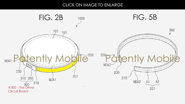 從專利圖中可以看出,這種智能手表的表盤外有一圈環(huán)形彎曲屏幕,可以顯示時間、天氣以及當(dāng)前播放的音樂等。據(jù)稱環(huán)形彎曲屏幕將被未來的Gear智能手表采用。
