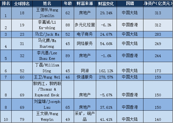 在最富有的華人前十名中,萬(wàn)達(dá)集團(tuán)董事長(zhǎng)王健林以313億美元凈資產(chǎn)位居榜首,并穩(wěn)居亞洲首富。香港首富李嘉誠(chéng)凈資產(chǎn)312億美元,排名第二。