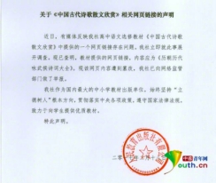 2017年2月,一則“中學(xué)語(yǔ)文教材出現(xiàn)黃色網(wǎng)站鏈接”的新聞被多家媒體報(bào)道和轉(zhuǎn)載,引起輿論高度關(guān)注。據(jù)多名網(wǎng)友爆料,在人民教育出版社出版的高中語(yǔ)文選修教材《中國(guó)古代詩(shī)歌散文欣賞》中所提供的一個(gè)參考網(wǎng)址,經(jīng)網(wǎng)友訪問(wèn)發(fā)現(xiàn)其指向的是一個(gè)黃色網(wǎng)站。