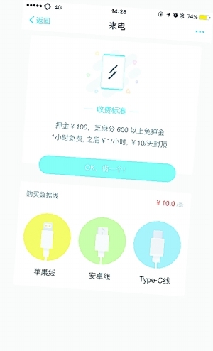 6月28日,北京商報(bào)記者來(lái)到朝陽(yáng)大悅城,體驗(yàn)來(lái)電科技出品的充電寶,該品牌充電寶位于大悅城地下一層地鐵出入口附近,首先映入眼簾的是“免押金”三個(gè)大字,但仔細(xì)觀察后可以發(fā)現(xiàn),所謂的免押金需要芝麻信用達(dá)到600分以上,當(dāng)北京商報(bào)記者掃描充電寶機(jī)身上的二維碼時(shí),手機(jī)會(huì)提示確認(rèn)開(kāi)通支付寶免密支付的協(xié)議,開(kāi)通后可以進(jìn)入租借界面,值得注意的是,來(lái)電科技的充電寶不提供數(shù)據(jù)線服務(wù),但租借界面提供購(gòu)買(mǎi)數(shù)據(jù)線的服務(wù),包括蘋(píng)果數(shù)據(jù)線、安卓數(shù)據(jù)線以及Type-C數(shù)據(jù)線。如果用戶芝麻信用沒(méi)有達(dá)到600分以上則需要繳納100元的押金。來(lái)電充電寶的收費(fèi)情況為1小時(shí)內(nèi)免費(fèi),超過(guò)1小時(shí)后1元/時(shí),10元/天封頂。經(jīng)過(guò)實(shí)際體驗(yàn)后北京商報(bào)記者發(fā)現(xiàn),來(lái)電科技的充電寶輸出可達(dá)到2.5A,一部iPhone 6s 10分鐘充電約5%。但退還時(shí)提示不明顯,導(dǎo)致記者一次退還失敗。