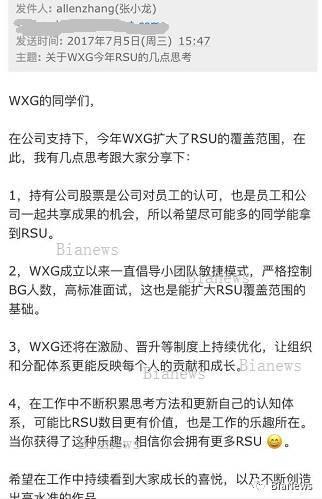 據BiaNews報道,張小龍近日下發(fā)的內部郵件顯示,在公司的支持下,WXG得以擴大RSU(受限股票單位)的覆蓋范圍,希望盡可能多的員工獲得RSU。