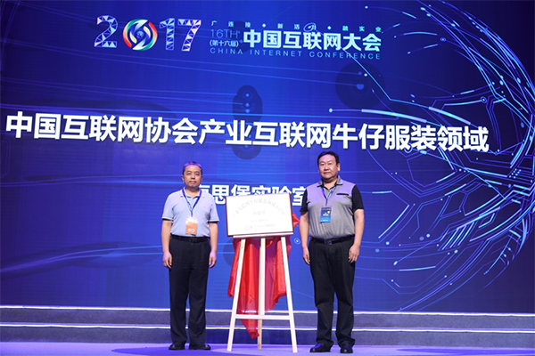 中國(guó)互聯(lián)網(wǎng)協(xié)會(huì)秘書(shū)長(zhǎng)盧衛(wèi)與山東海思堡服裝服飾集團(tuán)股份有限公司董事長(zhǎng)馬學(xué)強(qiáng)為“產(chǎn)業(yè)互聯(lián)網(wǎng)牛仔服裝領(lǐng)域海思堡實(shí)驗(yàn)室”揭牌