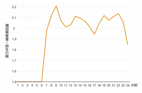 拼車條件下,單位行程載客量是訂單數(shù)和平均訂單載客量相乘的結(jié)果。打個(gè)比方,在一次拼車行程中共有3個(gè)訂單,每個(gè)訂單都有1位乘客,那么這趟行程就比相同條件下的非拼車行程多載2位客人。