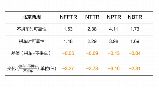 通過(guò)對(duì)比隨機(jī)兩周內(nèi)有拼車和無(wú)拼車情況下的北京交通可靠性指標(biāo),報(bào)告發(fā)現(xiàn)拼車可以讓NPTR(網(wǎng)絡(luò)規(guī)劃行程時(shí)間率)值減少0.13,NBTR(網(wǎng)絡(luò)緩沖行程時(shí)間率)值減少0.04。前者意味著在擁堵時(shí)拼車讓北京居民平均每千米節(jié)省7.8秒,后者則意味著,拼車讓北京居民平均每千米可以少預(yù)留2.4秒的出行時(shí)間。