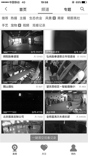 北青報(bào)記者在陳菲菲拍攝的視頻中看到,直播平臺(tái)平均每天觀看人數(shù)達(dá)到700多萬。點(diǎn)開360攝像機(jī)的軟件,其中一個(gè)板塊叫做水滴直播,在上面能夠看到形形色色的監(jiān)控畫面。光是北京,正在直播的就有657個(gè)。文中提到,直播平臺(tái)要求用戶張貼直播告示,《商家設(shè)置直播提示公告》要求在平臺(tái)開播的商家需要在直播區(qū)域設(shè)置明顯直播提示以告知顧客,提示貼紙需要在畫面明顯露出,或者在直播臺(tái)簡介中注明:“本店直播已告知顧客”類似文字,但調(diào)查者發(fā)現(xiàn)“商家不聽話,極少有張貼”。