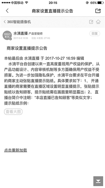 部分商家在進(jìn)行水滴直播時(shí),沒有盡到告知消費(fèi)者的義務(wù)。360智能攝像機(jī)的用戶協(xié)議要求商家開通直播時(shí),需要在直播區(qū)域設(shè)置明顯提示,例如張貼提示貼紙,以告知顧客。一旦發(fā)現(xiàn)商家沒有設(shè)置明顯提示,水滴直播將有權(quán)切斷其直播信號(hào)。