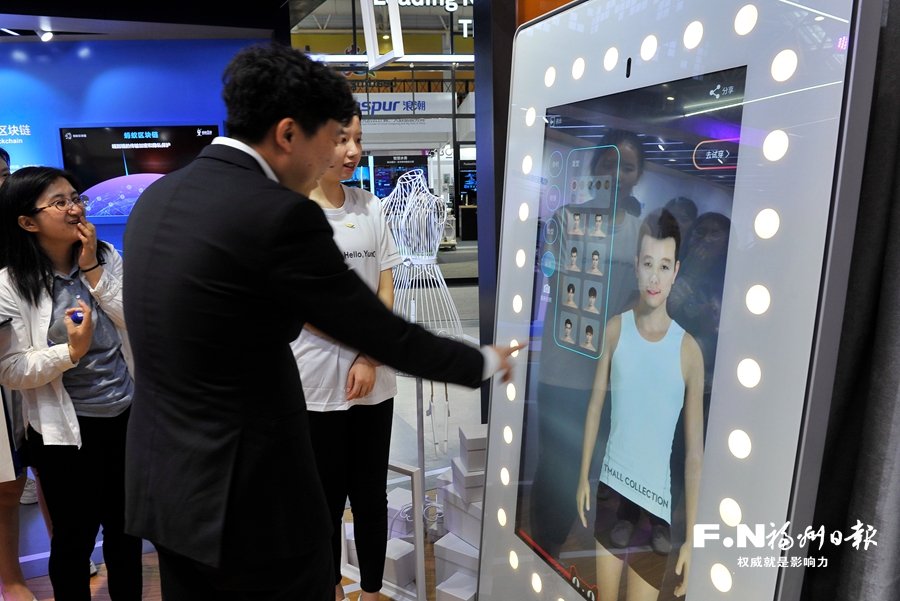 阿里巴巴展區(qū),參觀者體驗(yàn)智能試衣鏡。福州日報(bào)記者蔣雅琛林洛羽/文池遠(yuǎn)/攝