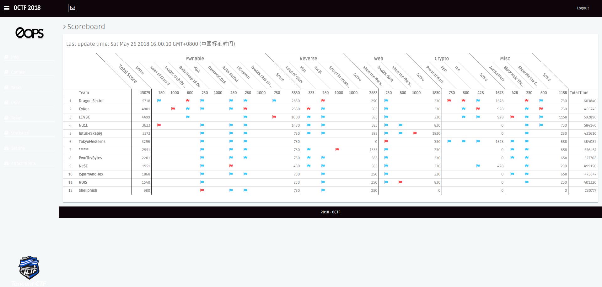 5月26日決勝之日,各大戰(zhàn)隊之間的較量進入白熱化。面對韓國CyKor戰(zhàn)隊在首日的“霸榜”表現(xiàn),波蘭Dragon Sector戰(zhàn)隊奮起直追,不斷縮小與CyKor戰(zhàn)隊的分差,并在11:35成功反超,首次出現(xiàn)在得分榜首位。隨后兩支戰(zhàn)隊的競爭進入高潮,交替爭奪榜首位,在比賽的最后兩小時形成拉鋸戰(zhàn)。最終,波蘭Dragon Sector戰(zhàn)隊憑借917分的大比分領(lǐng)先,以總分5718分斬獲TCTF 2018國際賽冠軍,韓國CyKor戰(zhàn)隊和俄羅斯LCBC戰(zhàn)隊以總分4801、4499分獲亞軍、季軍。