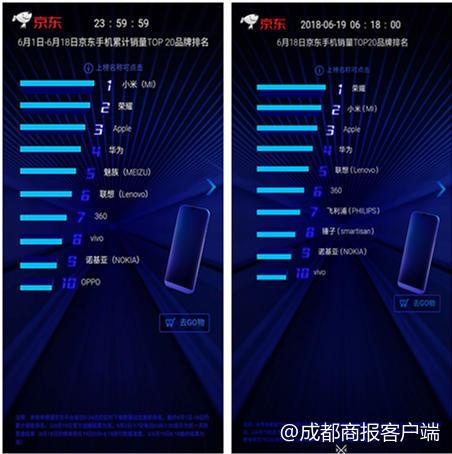 2、關(guān)于榮耀和小米在6月1日-18日累計銷量排名出現(xiàn)的變化,是因為6月18日0:00開始,根據(jù)競速榜規(guī)則,系統(tǒng)對下單后6小時未結(jié)算的訂單進行了刪除,導(dǎo)致6月19日,榮耀和小米 的在6月1日-18日累計銷量排名發(fā)生變化。