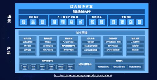 第三層是場景化解決方案層,包括信用城市解決方案、AI+城市產業(yè)規(guī)劃解決方案、智能停車場解決方案、智能園區(qū)解決方案和智能城市APP五大場景化解決方案。解決方案可以調用不同種類的產品,比如在智能園區(qū)解決方案中,會綜合使用智能交通中的停車管理產品、智能規(guī)劃中的智能選址產品、智能能源中的燃氣站健康度評估產品,針對智能園區(qū)的特定場景,組成一整套解決方案。