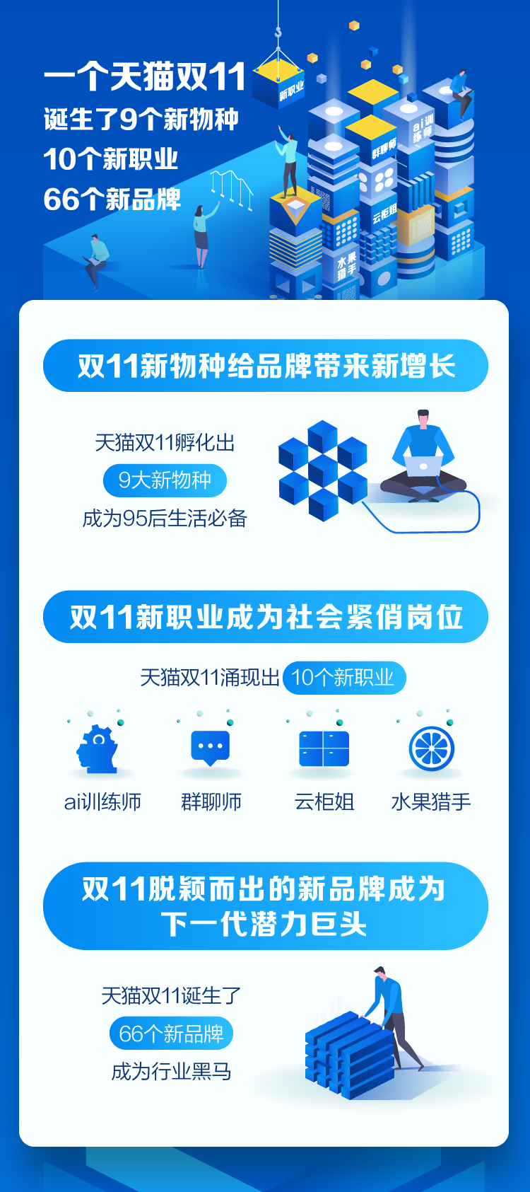 群聊師的人才缺口為300萬,水果獵人月薪高達2萬。同時,筋膜槍、喵喵機、洗鞋機、三明治早餐機等新物種,也引發(fā)網(wǎng)友討論。新物種的走紅也帶火了一批新銳品牌,天貓雙11,66個新銳品牌冒尖。其中,三頓半、SHARK等11個新銳品牌拿下品類排行榜第一,更有完美日記、HFP、花西、Dr.Arrivo、小仙燉、燕之屋6個新品牌單日成交超過1億,與蘋果、耐克等大牌同登天貓雙11“億元俱樂部”。