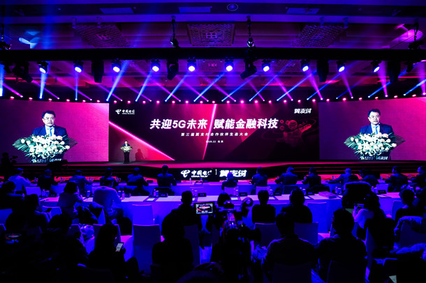 第三屆翼支付合作伙伴生態(tài)大會現場,中國電信集團有限公司副總經理王國權致辭。(翼支付供圖)