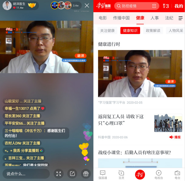 2月6日,“學習強國”學習平臺與快手攜手,邀請相關領域專家、名醫(yī),為全國用戶就疫情防護進行不同主題的科普和答疑。首場直播由上海市肺科醫(yī)院副主任醫(yī)師胡洋主講,系統地介紹了疫情防護知識并為老鐵們辟謠。快手用戶為胡醫(yī)生送出181.35萬個贊。