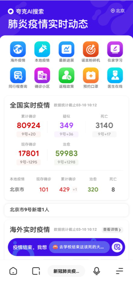 1月21日,夸克緊跟疫情進(jìn)展推出“肺炎疫情實(shí)時(shí)動(dòng)態(tài)”專(zhuān)區(qū),聚合來(lái)自官方機(jī)構(gòu)、權(quán)威媒體發(fā)布的疫情動(dòng)態(tài)資訊,細(xì)化到市級(jí)的全國(guó)疫情分布數(shù)據(jù),實(shí)時(shí)更新疫情地圖和趨勢(shì)圖,讓公眾隨時(shí)隨地了解本地疫情,目前已經(jīng)服務(wù)了數(shù)百萬(wàn)用戶(hù)。