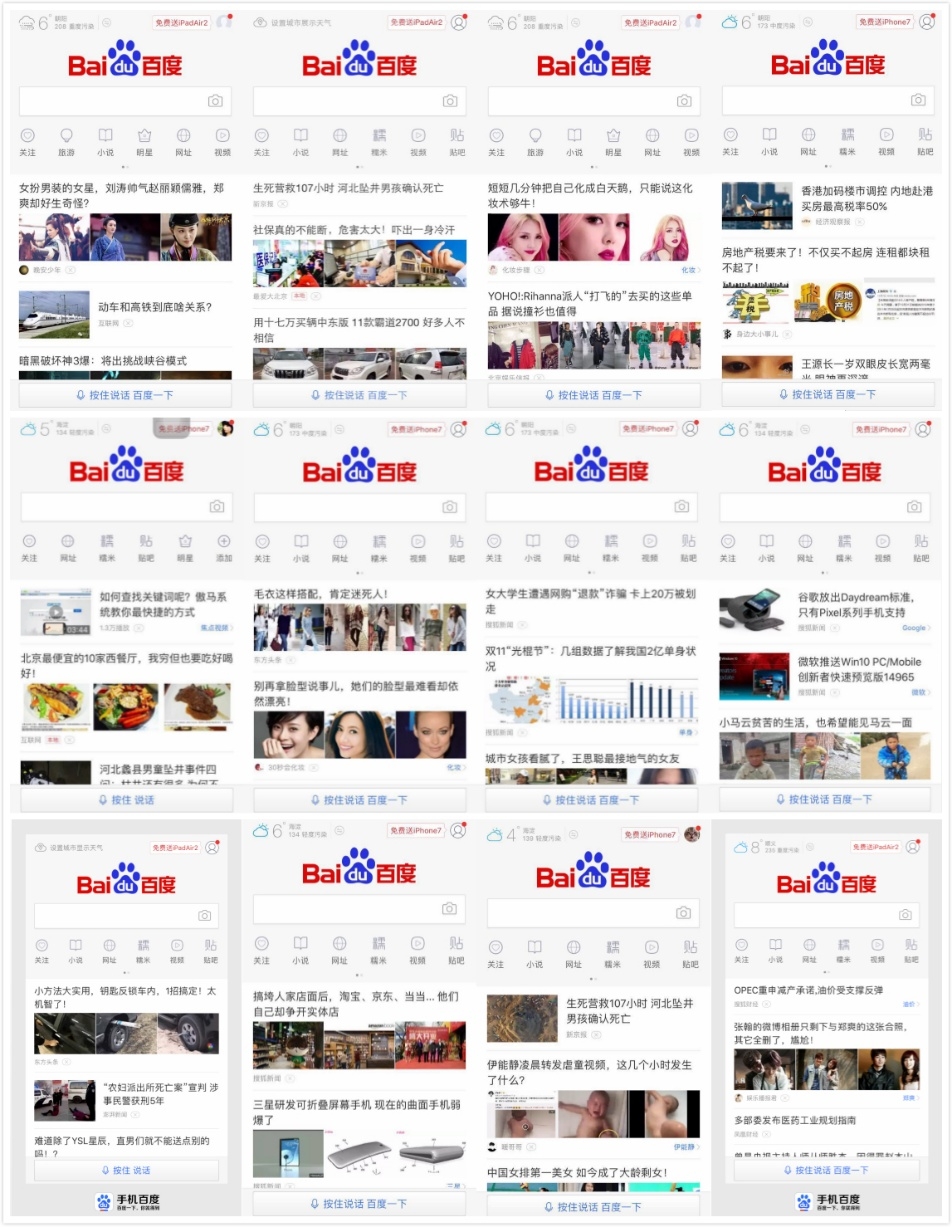歷時(shí)三個(gè)小時(shí),三路記者累計(jì)收集了309張路人的手機(jī)百度資訊流截圖,從截圖來(lái)看,記者確實(shí)找不到完全相同的兩個(gè)手機(jī)百度資訊流。但是當(dāng)記者進(jìn)行了一番數(shù)據(jù)統(tǒng)計(jì)之后,也發(fā)現(xiàn)了一些有趣的共性和更多的個(gè)性。