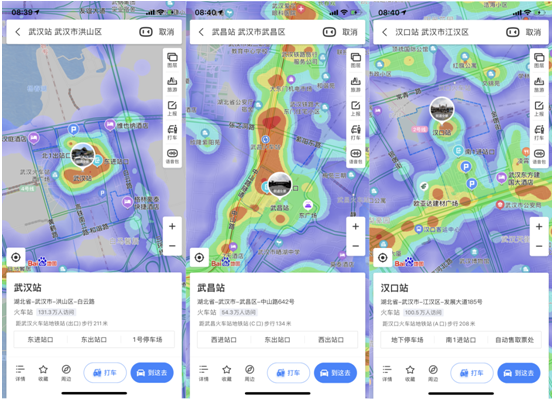 隨著市民出行增加,武漢市各大交通樞紐的人流量也迅速密集起來。據(jù)4月9日8:40左右百度地圖熱力圖顯示,武漢、武昌、漢口三大火車站均顯示橙色或紅色,表示人員較為密集,且附近路段出現(xiàn)了一定范圍的“堵車紅”。