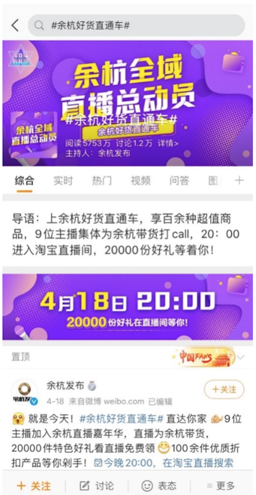 本次#余杭好貨直通車#的宣推充分認(rèn)識到了流量的重要作用。在直播前,@余杭發(fā)布 充分利用微博的巨大聲量進(jìn)行傳播推廣,再導(dǎo)流到淘寶進(jìn)行進(jìn)一步的經(jīng)濟(jì)轉(zhuǎn)化。作為一個綜合平臺,微博在這個過程中能夠?yàn)槠放铺峁┲辈デ、直播中、直播后期的全流程話題營銷。在微博進(jìn)行前期宣推,到淘寶進(jìn)行直播售賣,最后再回到微博進(jìn)行效果傳播、品牌印象加固,形成了一次直播帶貨活動的完美閉環(huán)。