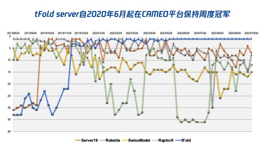 在研究方面,tFold平臺(tái)已在國(guó)際公認(rèn)最權(quán)威的測(cè)試平臺(tái)CAMEO上證明其創(chuàng)新價(jià)值及有效性。騰訊AI Lab于2020年初在CAMEO平臺(tái)注冊(cè)了自動(dòng)化蛋白結(jié)構(gòu)預(yù)測(cè)服務(wù)器tFold server,并自2020年6月起至今一直保持周度(圖1)、月度、季度、半年度冠軍。tFold server在一般案例上領(lǐng)先業(yè)內(nèi)權(quán)威方法6%以上,在困難案例上則領(lǐng)先12%以上。