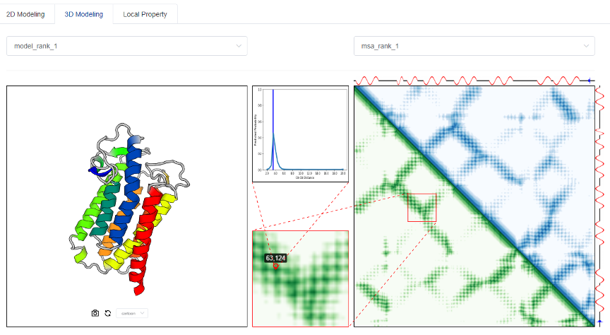 tFold server的3D Modeling輸出頁(yè)面。左邊部分為從頭折疊得到的3D蛋白模型;右邊部分是該3D模型在給定的預(yù)測(cè)殘基對(duì)距離矩陣下的偏差。