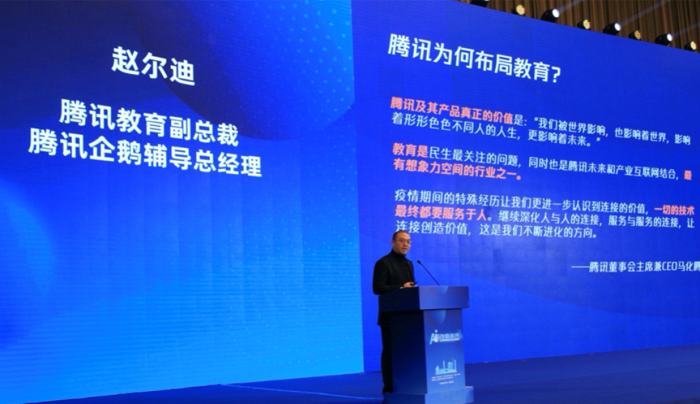 在峰會(huì)主論壇,趙爾迪發(fā)表《科技向善:技術(shù)推動(dòng)智慧教育升級(jí)》主題演講,系統(tǒng)介紹了騰訊教育成立的背景、目標(biāo)、業(yè)務(wù)、智慧教育解決方案、平臺(tái)能力和教育成果。據(jù)他介紹,科技向善是騰訊的企業(yè)使命愿景,通過技術(shù)推動(dòng)在線教育智慧化是騰訊努力的方向。