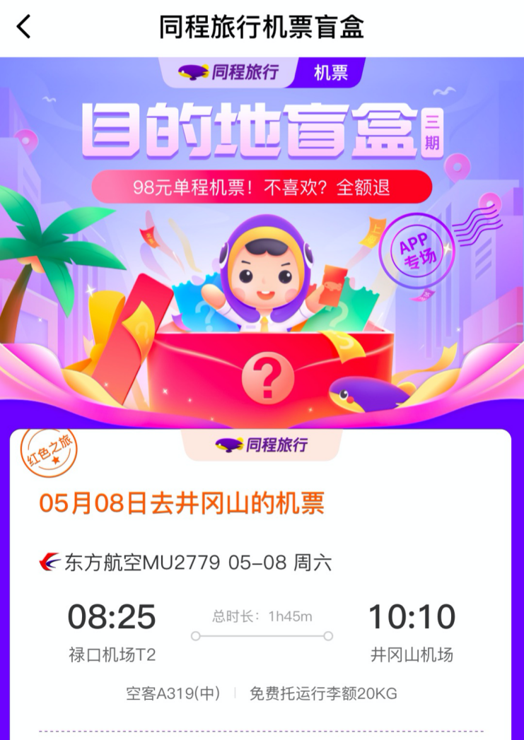 據(jù)了解,同程旅行機(jī)票盲盒第三期活動(dòng),仍延續(xù)了此前用戶喜愛的玩法。用戶只需要花費(fèi)98元(含稅),就可以開啟一張指定出發(fā)地,隨機(jī)目的地、隨機(jī)出發(fā)時(shí)間的國(guó)內(nèi)機(jī)票,如果開出不滿意的機(jī)票還可以全額退款。相比其他模仿跟進(jìn)的盲盒活動(dòng),同程旅行的盲盒活動(dòng)玩法更簡(jiǎn)單,無(wú)需邀請(qǐng)好友助力,同程機(jī)票盲盒活動(dòng)囊括國(guó)內(nèi)200多個(gè)出發(fā)地及200多個(gè)目的地機(jī)場(chǎng),出行時(shí)間包含了當(dāng)下最熱門的“五一”小長(zhǎng)假,還加入了用戶呼聲最高的雙人機(jī)票、往返機(jī)票、公務(wù)艙等“隱藏款”;顒(dòng)期間每天10:00、14:00、20:00開放機(jī)票盲盒搶購(gòu),無(wú)論此前是否購(gòu)買過機(jī)票盲盒,每位用戶在本期返場(chǎng)活動(dòng)中都有1次購(gòu)買機(jī)會(huì)。