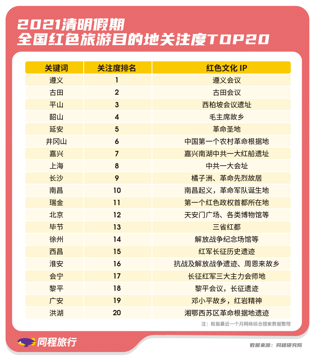 同程旅行發(fā)布的《2021清明及“五一”假期紅色旅游報(bào)告》顯示,今年春季以來(lái)全國(guó)主要紅色旅游目的地(擁有重要紅色文化IP的目的地)網(wǎng)絡(luò)關(guān)注度持續(xù)上升。其中,遵義、古田、平山、韶山、延安等與中國(guó)共產(chǎn)黨發(fā)展歷史、抗戰(zhàn)歷史及解放戰(zhàn)爭(zhēng)等密切相關(guān)的紅色旅游目的地更受關(guān)注。