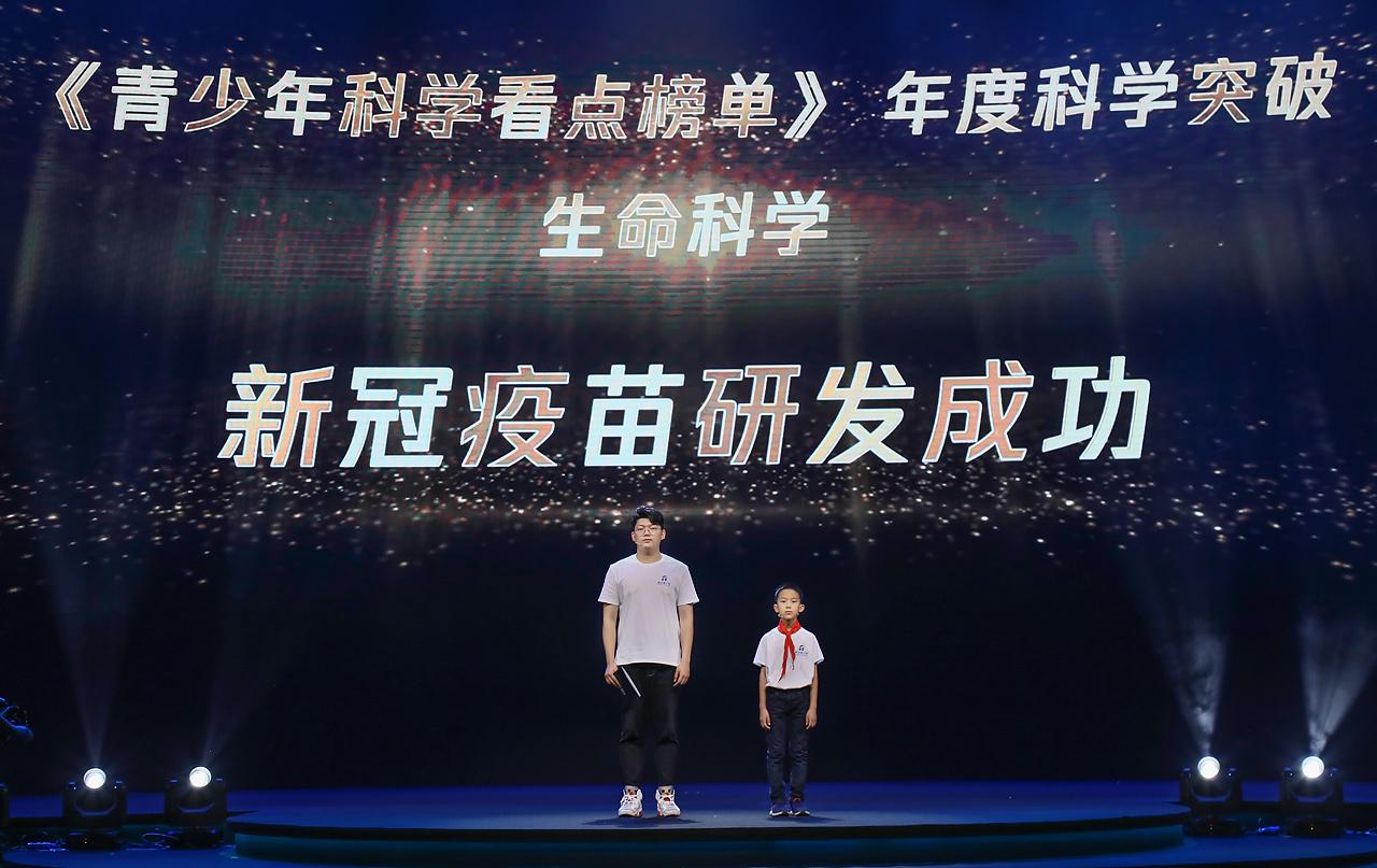 新冠康復(fù)者彭昕燁(19歲)和好奇少年李家齊(9歲)為科學(xué)家頒獎