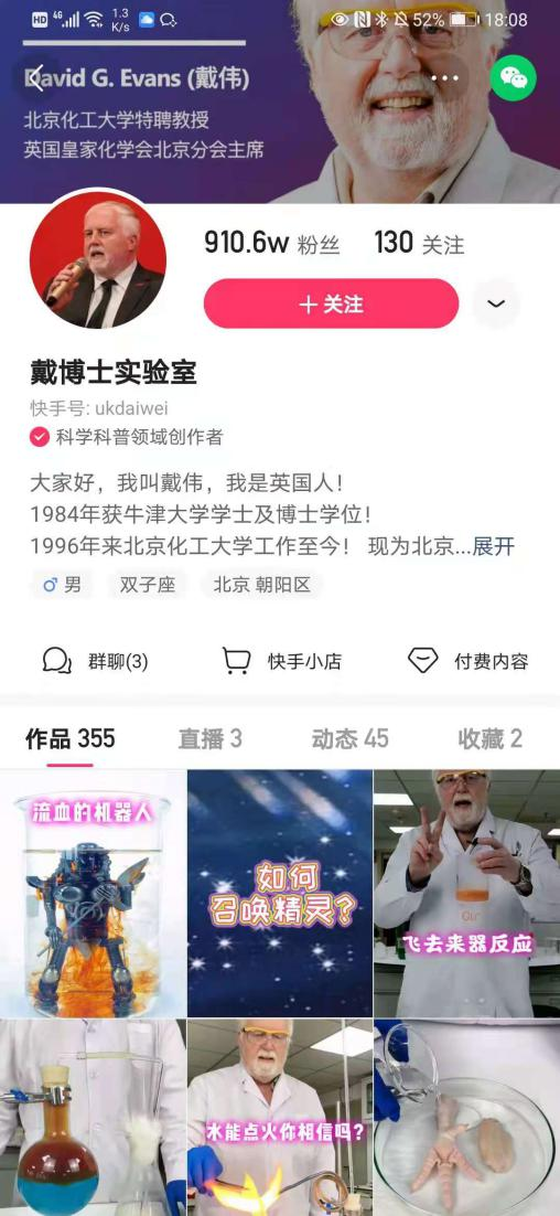 以快手科普領(lǐng)域創(chuàng)作者戴博士為例。身為牛津大學(xué)化學(xué)博士、北京化工大學(xué)教授,來華20年,致力于通過各種新奇實驗進行化學(xué)科普,足跡遍布中國許多邊遠鄉(xiāng)村。2019年,在戴博士牽頭下,快手聯(lián)合英國皇家化學(xué)協(xié)會舉辦“化學(xué)夏令營”項目,讓更多人發(fā)現(xiàn)化學(xué)的神奇。目前,戴博士在快手粉絲超過910萬。
