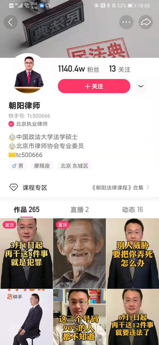 另一個快手新知達人“朝陽律師”,2016年入駐快手,第二年粉絲就沖破百萬,現(xiàn)在已經(jīng)有1140萬名粉絲,致力于進行法律方面的科普與援助。目前,“朝陽律師”通過在快手上每周可以收到80多個法律咨詢訂單,并提供法律知識付費課程,成為職業(yè)創(chuàng)作者經(jīng)營變現(xiàn)的教科書之一。