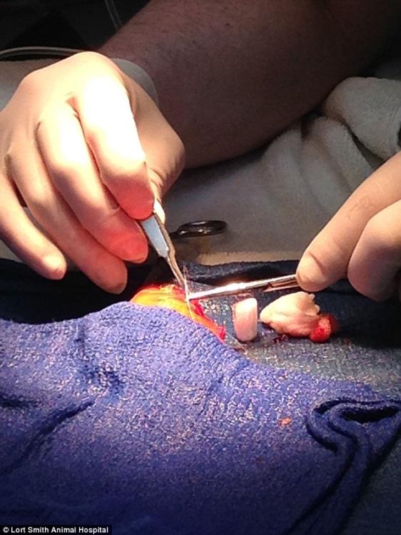 據《每日郵報》2014年9月15日報道,澳大利亞Lort Smith動物醫(yī)院提供的圖片顯示,醫(yī)生正在給一條10歲的金魚做腦瘤手術。這條金魚名為George。主刀醫(yī)生Tristan Rich描述這一長達45分鐘的手術是高難度的,金魚一直服用著含有麻醉的水。(網頁截圖)