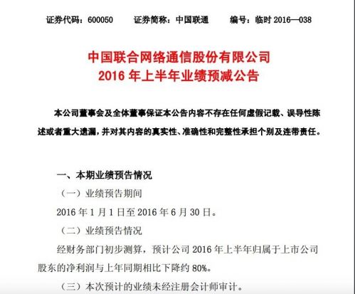 中國(guó)聯(lián)通發(fā)布盈利預(yù)警:上半年凈利暴跌80%